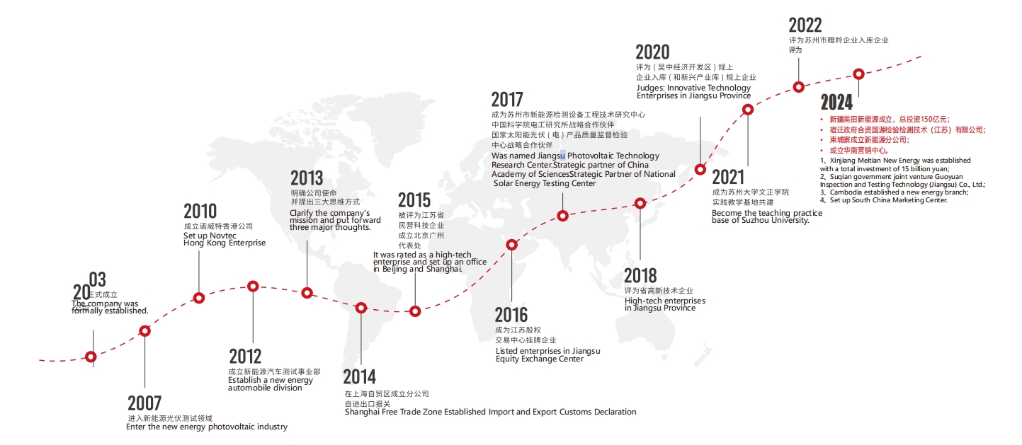 AT THE END OF 2016I NOVlT WAS SUCCESSFULLY LlSTED lN JlANGSU EQUlTY EXCHANGE CENTER. lN 2018I lT WAS AWARDED AS A NATlONAL HlGH-TECH ENTERPRlSE. SUZHOU NEW ENERGY TESTlNG EQUlPMENT ENGlNEERlNG TECHNOLOGY RESEARCH CENTER lS THE VlCE-PRESlDENT UNlT OF CHlNA RENEWABLE ENERGY ENTERPRISE DEVELOPMENT PROMOTION ASSOCIATION, THE DIRECTOR UNIT OF SHANGHAI SOLAR ENERGY SOCIETY AND THE MEMBER UNIT OF GEA GREEN ENERGY INDUSTRY DEVELOPMENT PROMOTION ASSOCIATION.